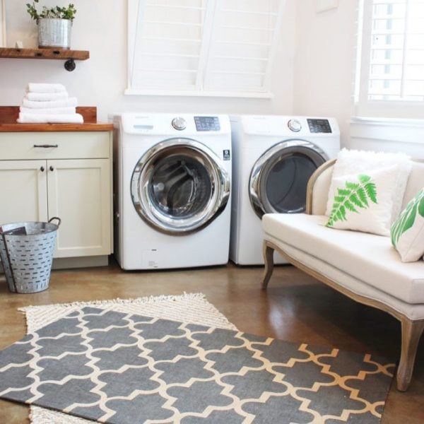 The final touches to my laundry room space were the decorative accents such as planters, wire basket, metal basket, and colorful rugs are all part of the theme for my laundry room space. I have been working hard stenciling pillows. Check out the stencil pillow here. This pillow will be perfect for the settee. Botanical framed prints will be placed on the shelves to give the whole laundry space a pretty charming.