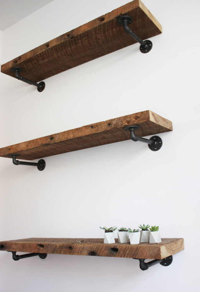 Above the cabinet I also added reclaimed wood shelves to hold soaps, towels and some decorative accents to give charm. Open shelving keeps everything accessible. The open shelving was made with plumbing pipes that were installed with screws into the wall. The Reclaimed shelves lay over the pipes.