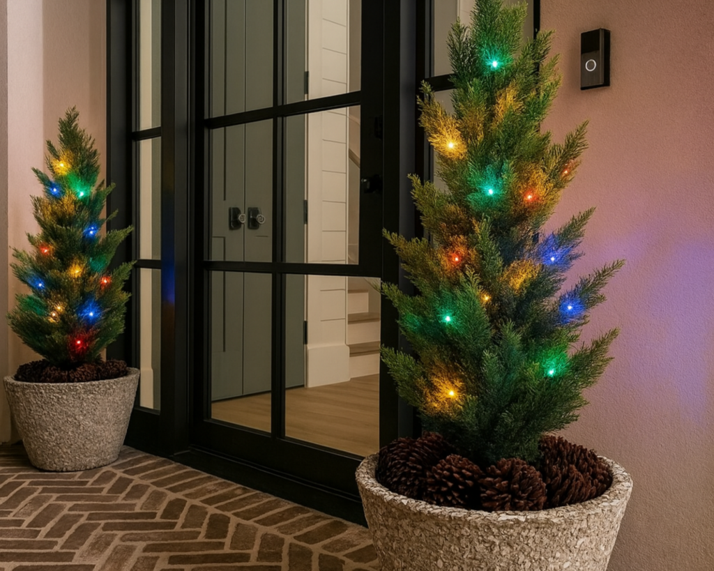 If the lights are battery-operated, hide the battery pack under the pinecones or within the planter. For plug-in lights, ensure the cord reaches an outdoor outlet safely.