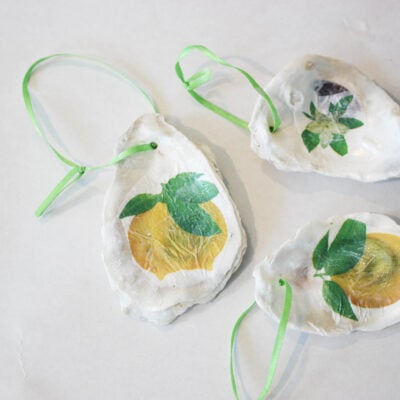 Lemon oyster shell Christmas ornaments are incredibly easy to make and will make your holiday tree look amazing. These stylish ornaments are made from oyster shells, lemon napkins, and Modpodge.