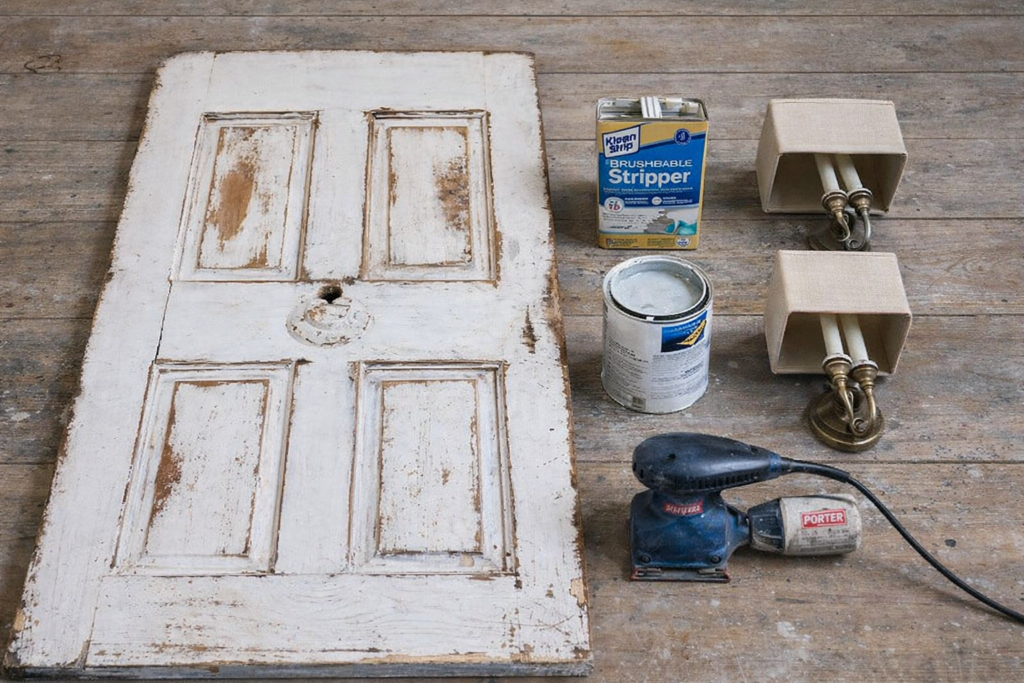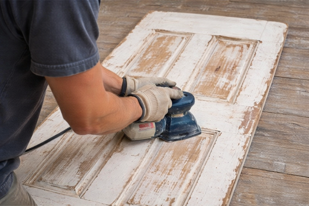 Start by sanding the old door to remove any rough spots and old paint. Use coarse-grit sandpaper to work over the entire surface, focusing on areas with peeling paint or uneven textures. Once the old paint is smoothed out, switch to a finer-grit sandpaper for a more even finish. Sand down the edges to create a naturally distressed look. Wipe off any dust with a clean cloth, and your door is ready.