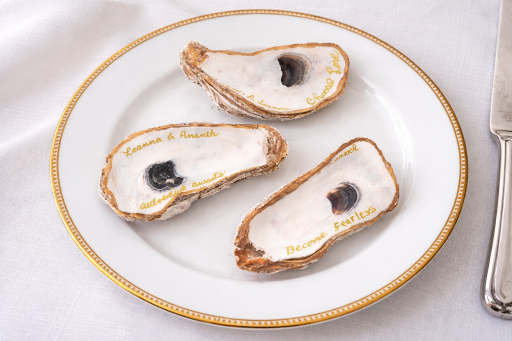 3. With a gold paint pen write whatever you like. I made these for my daughter engagement party so I wrote her name and her fiancé. On the bottom I wrote inspiration quotes they came up with. Tip: Start by writing in script their names on paper to get used to the way it feels to write with the gold pen. Tap the tip on paper to release the gold paint. Then start writing on the oyster shell.