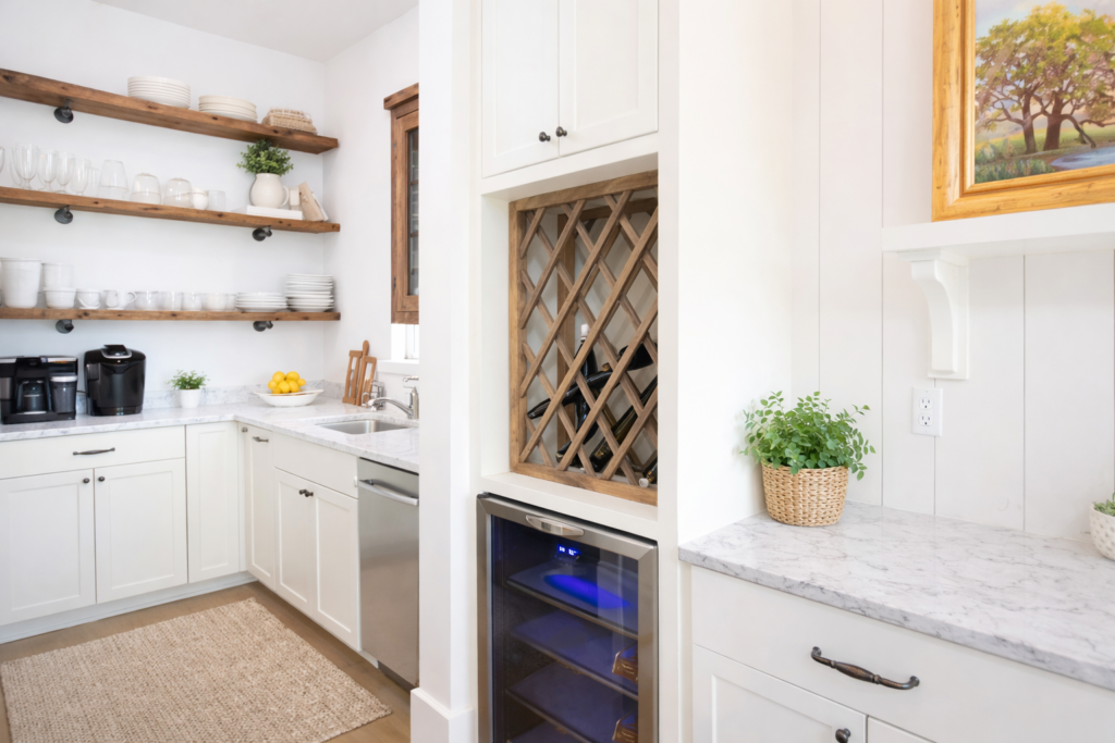 Adding fresh greenery, such as potted herbs or a vase of seasonal flowers, can breathe life into the room effortlessly. I aded in my kitchen in my home in Plametto Bluff a herb garden. It create a cozy, inviting atmosphere for cooking. These small, thoughtful details come together to create a space that feels both stylish and connected to nature.. I also added a small potted herb plant by the sink, A woven basket with greenry on the window sill and a small plants for balance and softness. The wooden cutting board is a great way to display food naturally.